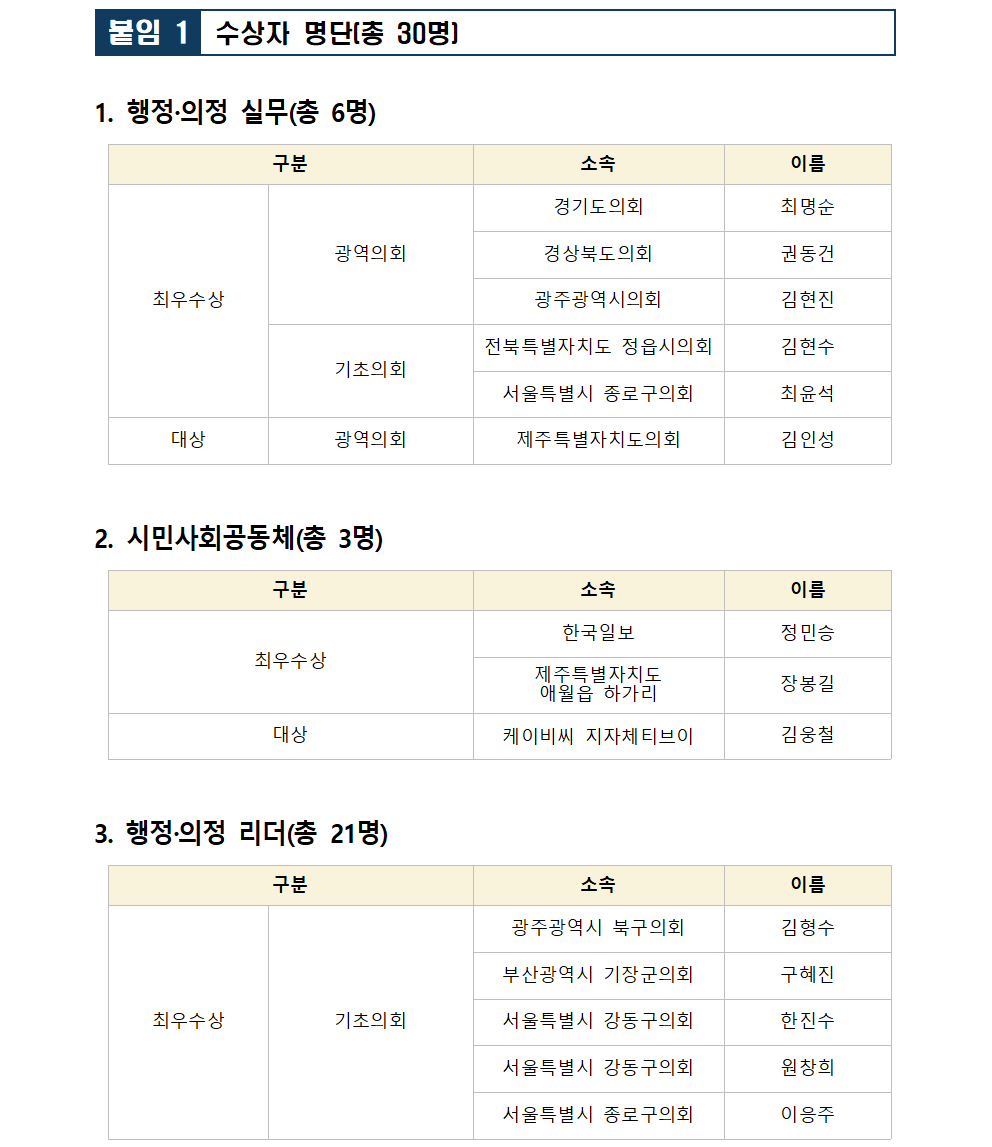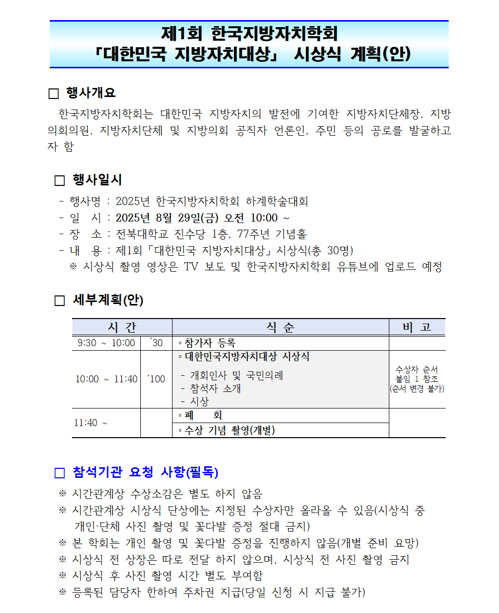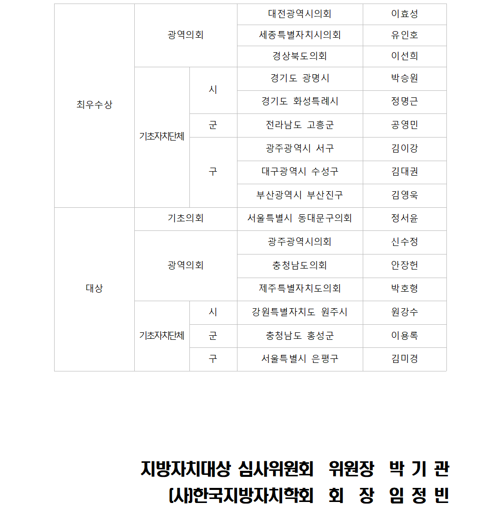 제1회 한국지방자치학회 「대한민국 지방자치대상」 선정 결과 및 시상식 계획 안내